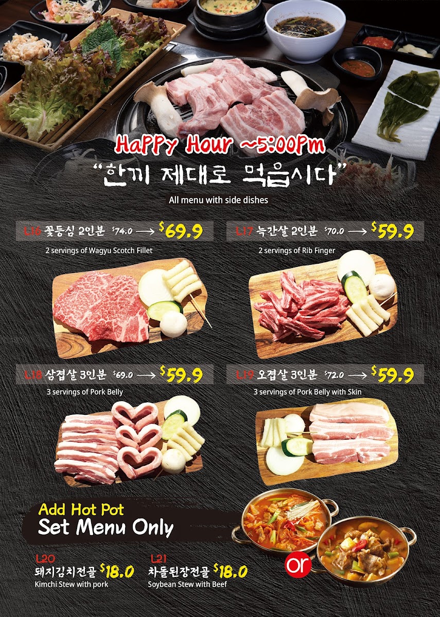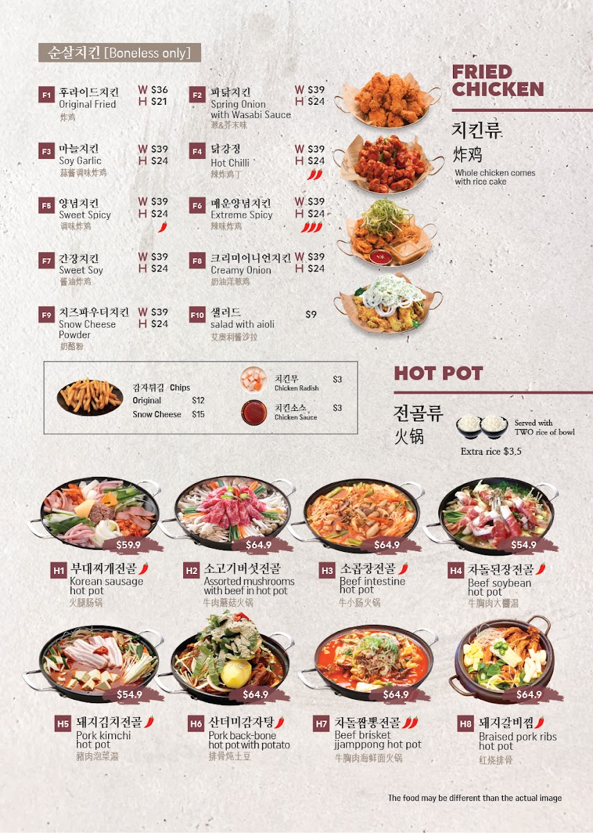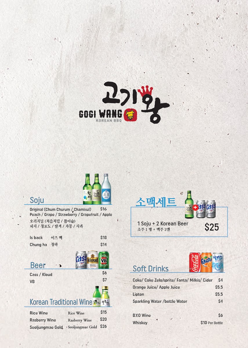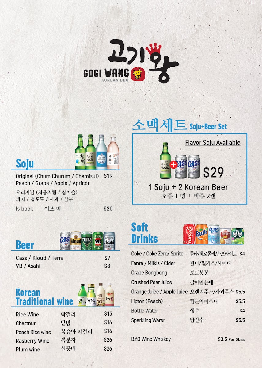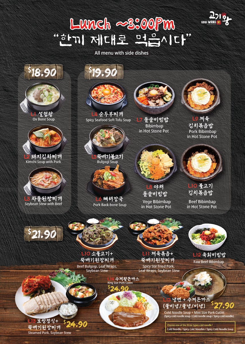 Nestled in the heart of Eastwood at 13 Railway Parade, Gogi Wang invites you to embark on a culinary adventure with our extraordinary menu that celebrates the rich and vibrant flavors of Korean cuisine. From our signature Seafood Kimchi that offers a perfect balance of spice and tang, to the refreshing Cold Noodle Soup Bulgogi, each dish is carefully crafted to tantalize your taste buds. Don’t miss our delectable Soy Garlic Boneless Fried Chicken and the soothing Seafood Tofu Soup, both guaranteed to leave you craving more. And if you're in the mood for something hearty, try our Pork Bone Soup or the sizzling 돌솥비빔밥 mixed bibimbap! With a variety of banchan (small sides) and unique dishes like Wasabi Fried Chicken and King Size Pork Cutlet, there’s truly something for everyone on the Gogi Wang Eastwood menu. Join us for a feast that promises not only to satisfy but to delight your senses!